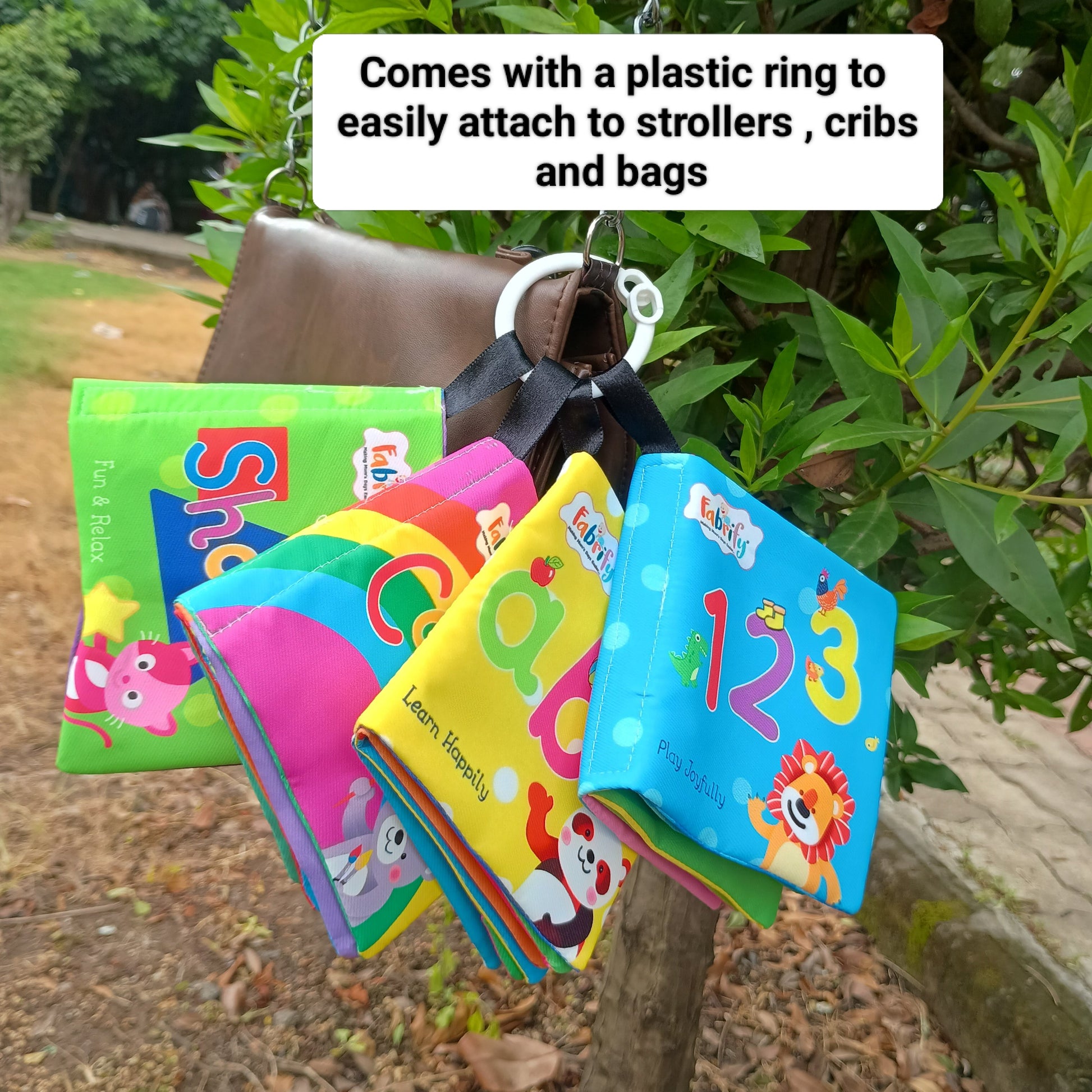 ✅ Set of 6 Soft Cloth Books – Each book covers a different early learning theme: Alphabet, Shapes, Fruits, and Numbers.